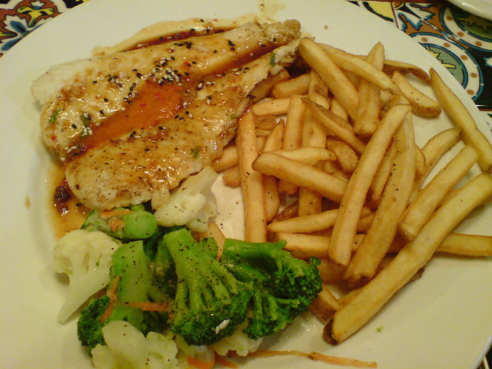 A grilled dory fish brushed with sweet & spicy glaze and garnished with red child tapenade & sesame seeds. Served with seasonal veggies and fries on the side.