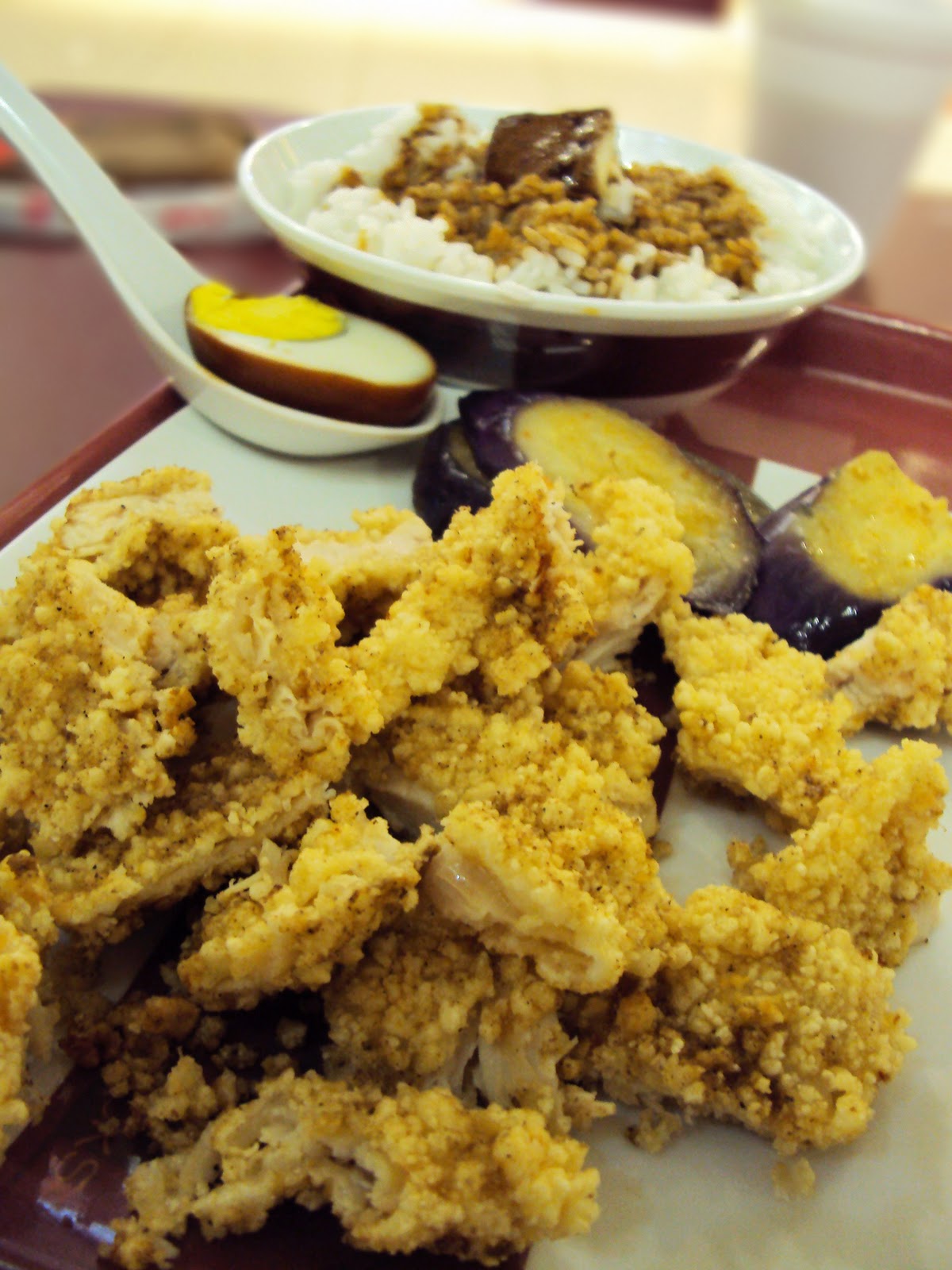 Tadaa….Here was our Crispy Chicken Bento Box. The set was consists of a bowl of white rice with some black pepper sauce and taufu on it, crispy chicken, few slices of brinjal and a spoon fed with half of the egg. And according to the shop, they said adding one egg can add protein and other nutrients to our diet. Kinda sweat with it.