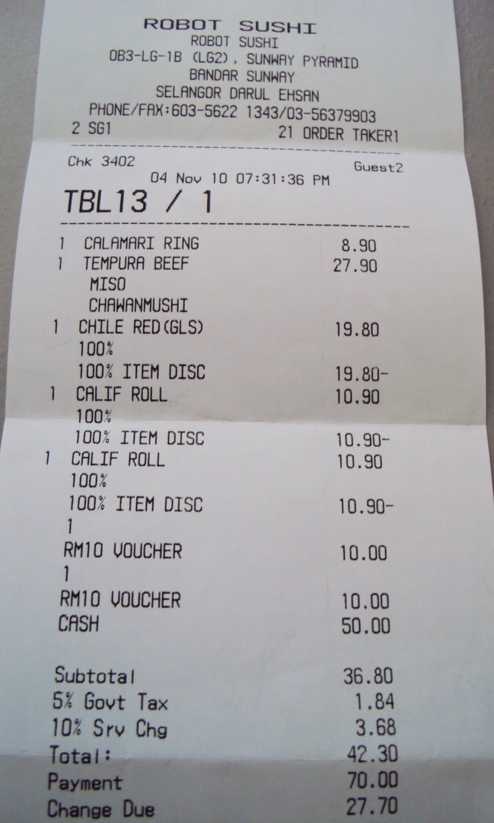 We only pay RM22.30 for all the food and drinks above, after tax and presenting two RM20 voucher. The pouring drink costed RM19.80 each and the California roll costed RM10.90 each and we got them FREE. Imagined the total pay would be more than RM100 if we ordered it ala carte. We walked out happily from Robot Sushi, for the bill, but not for the food.