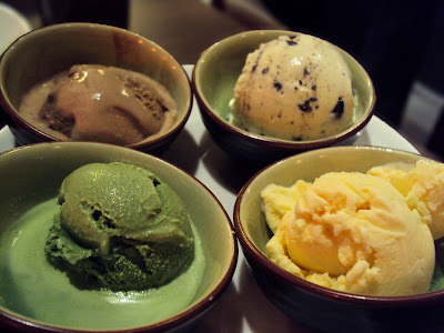 Clockwise from top left: chocolate, cookies and cream, peach fruit, green tea. My girl especially like the green tea flavor and took many scoops of it.