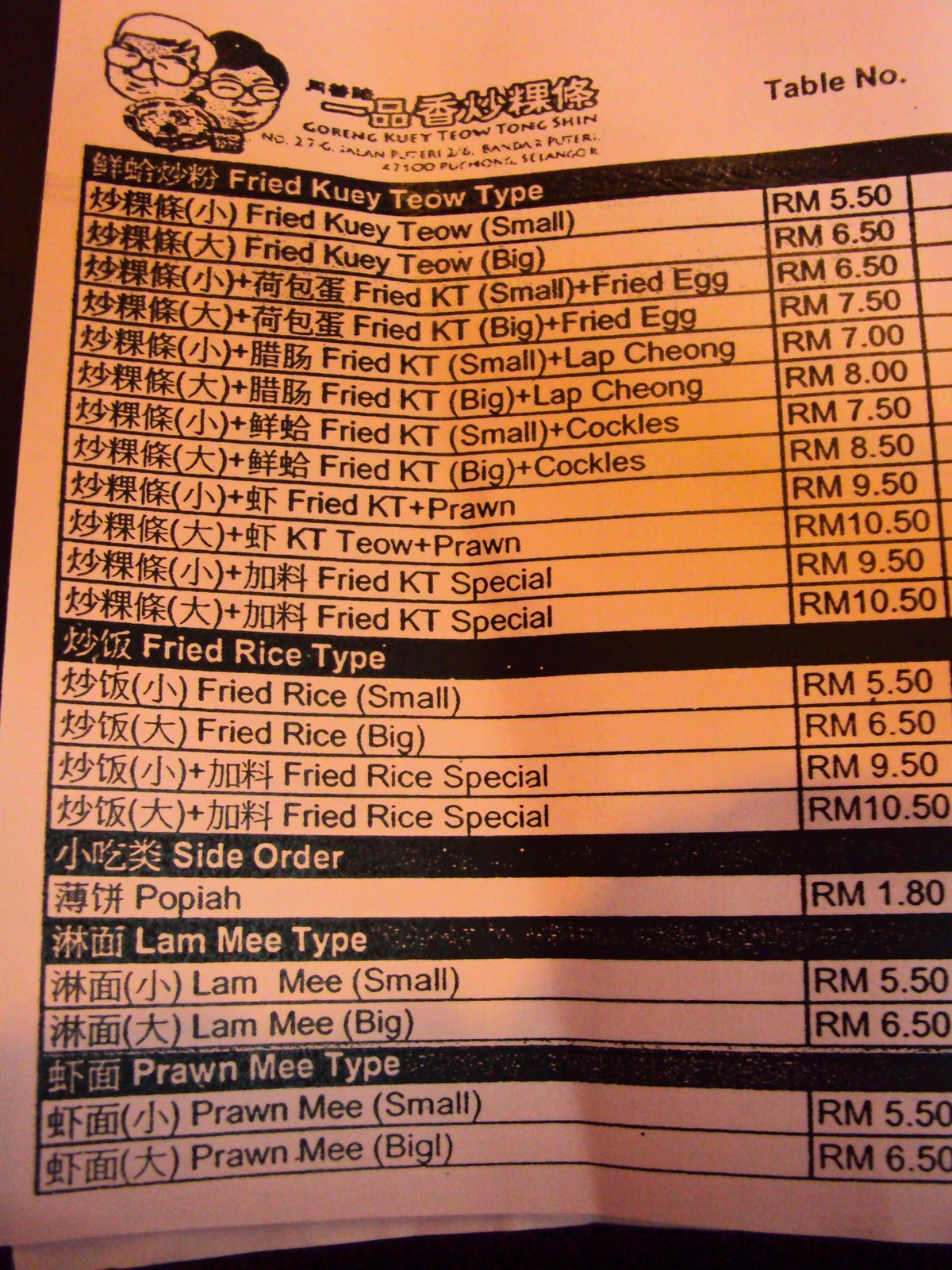 It was the second time we passed by this shop. I wasn’t very into char kuey teow tonight but I was clueless on what to eat for dinner. So I just parked my car and went in to Goreng Kuey Teow Tong Shin, a newly opend shop in Puchong. Being skeptical on the taste of street food that go into a shop, I wasn’t putting any special hope on the the food I gonna order, though it was famous Tong Shin kuey teow from Off Bukit Bintang. And I was right.